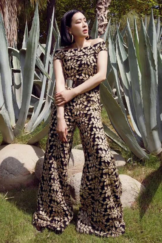 红色连体裤耀眼而夺目,接下来所换穿的印花连体裤则让人感觉高级感倍增。上半身一字肩的设计秀出精致锁骨线条、下半身阔腿喇叭裤的版型则自带有几分时尚意味。