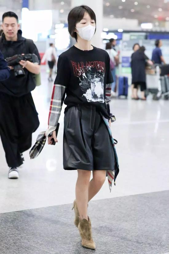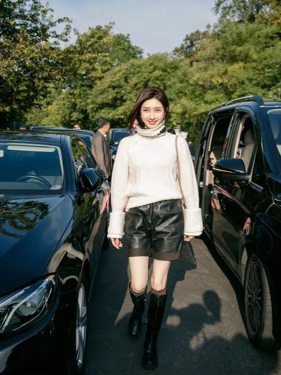 初秋的季节也是皮质短裤大行其道的时候,像江疏影这样皮裤与长筒马靴的搭配,既有整体造型感,又很有型。