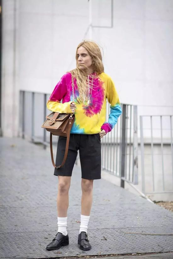 一些品牌为了能让老爹中裤更适应女性市场,在长度不变的基础上设计了稍微紧身一点的版型,更好搭配。像上图这样英伦风的短裤、白袜和皮鞋混搭彩色的卫衣,时尚度与温度共存,非常适合现在的季节。