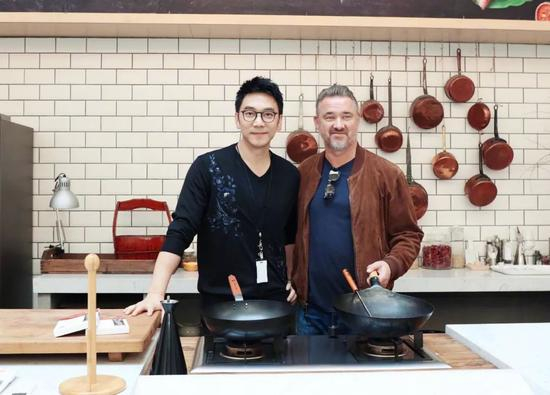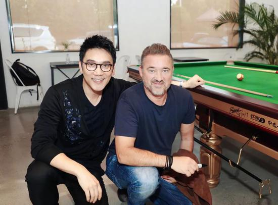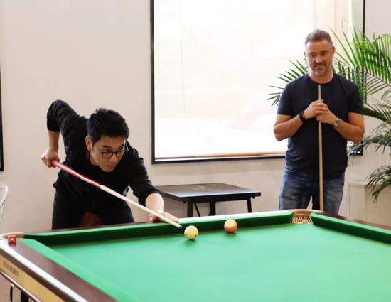 至于他身旁的这位外国友人,熟悉台球运动的小伙伴肯定会忍不住发出尖叫:这不是被称为“台球皇帝”的苏格兰职业斯诺克运动员斯蒂芬·亨德利嘛!亨德利装束同样简单日常,黑色T恤搭配棕色小夹克就ok,穿上一条牛仔裤,自然休闲的样子和普通男士出街没差,后梳背头尽显大师风范。