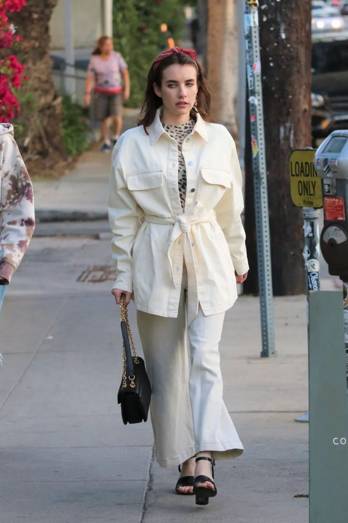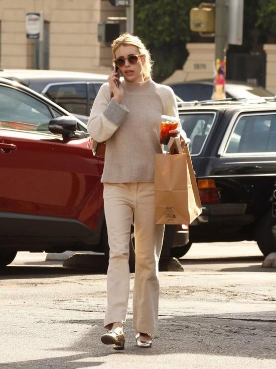 Emma Roberts全身上下除了裤子以外就几乎没有别的颜色,这样的搭配除了显瘦和显高以外,高级感十足。