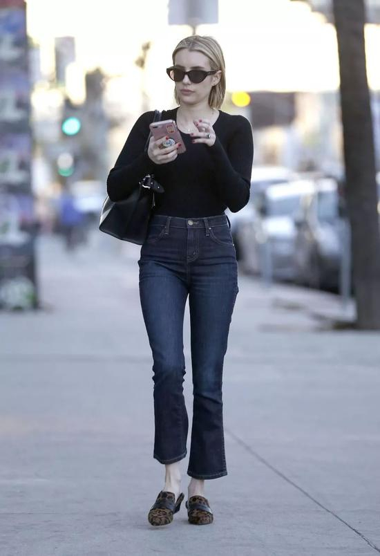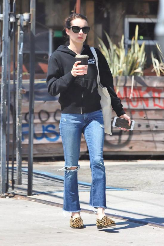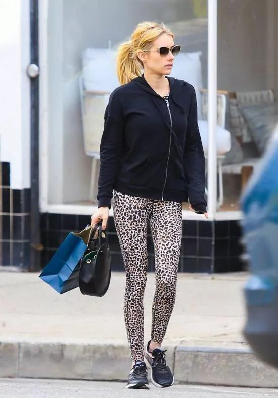 除了豹纹裤子以外,Emma也很喜欢豹纹的乐福鞋。一双豹纹的乐福鞋就能让普通的搭配变得十分chic,遇到卫衣和牛仔裤这种路人搭配,也能给全身气场加分不少。