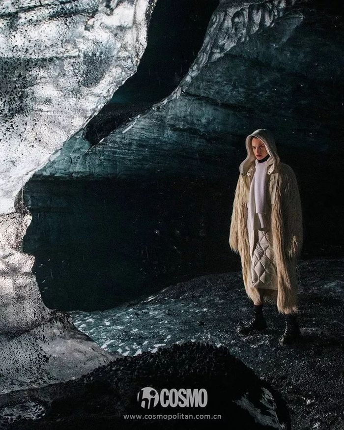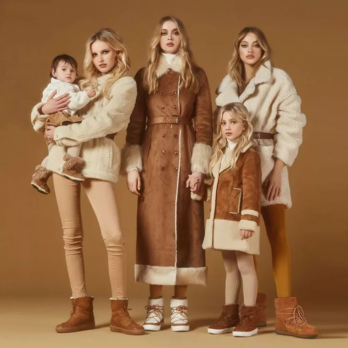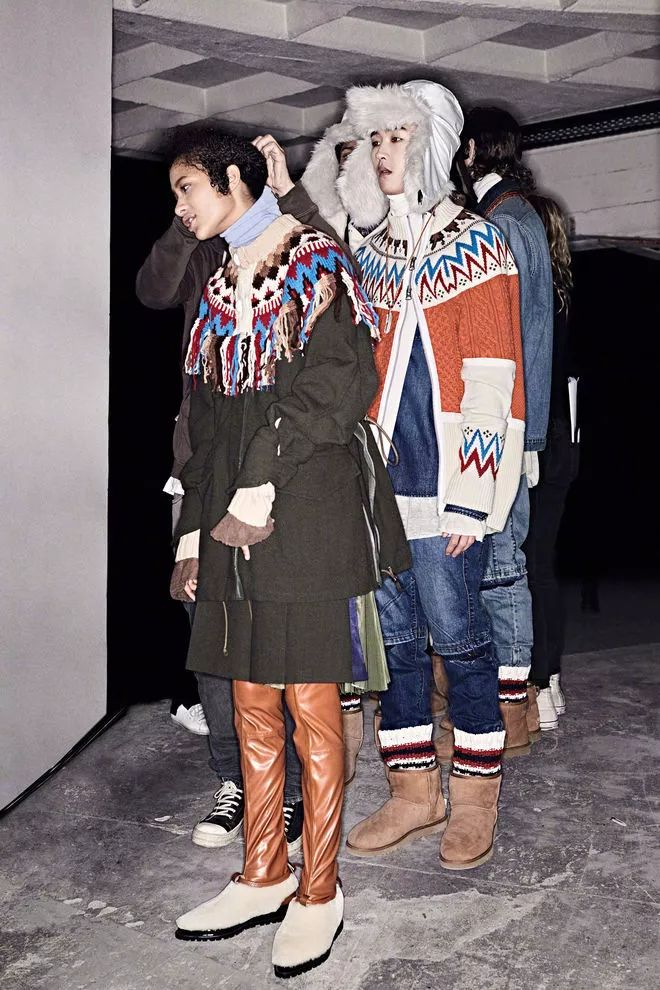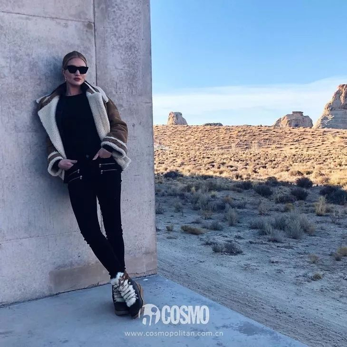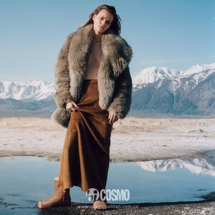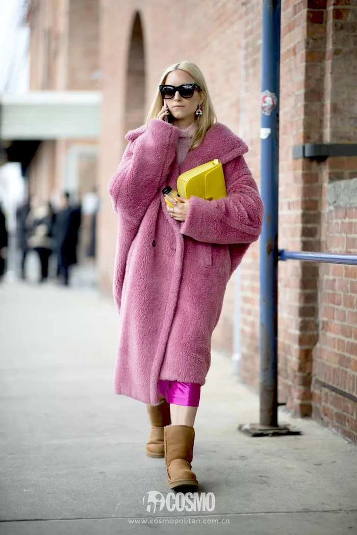 皮毛一体的外套除了外部挡风、内部保温,它还自带swag气息。而且仔细看看你的雪地靴,它其实就是皮毛一体材质,在质感上的搭配真的是天衣无缝。