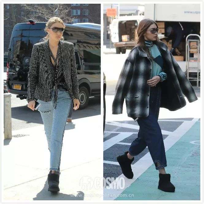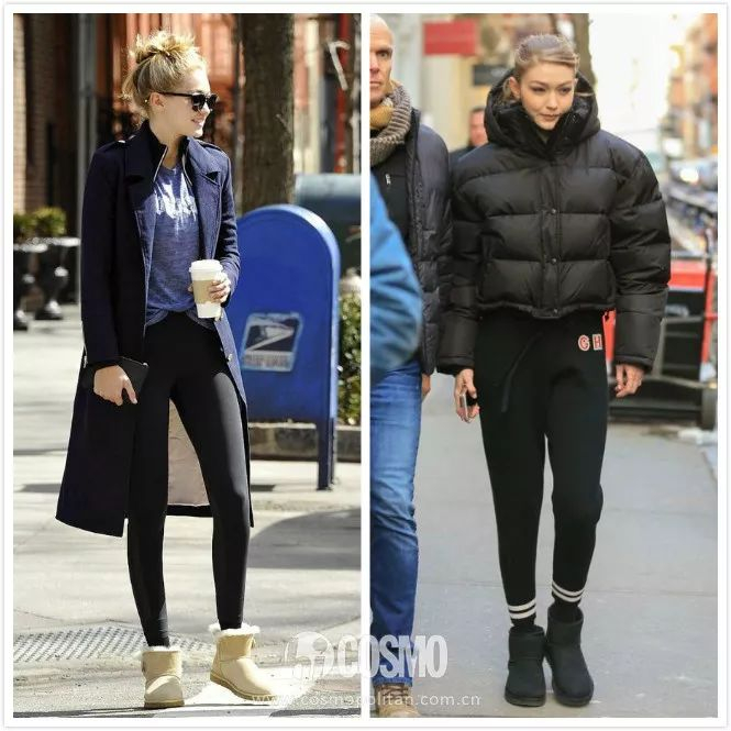 打底紧身裤配雪地靴所形成宽窄对比,才是显瘦的关键,这种搭配方法Gigi Hadid穿了5年。