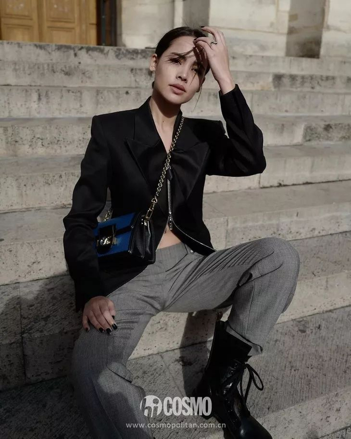 Mai自从剪了短发后,西装品格真是好到吓死人。斜肩上衣与廓形西装组合配搭,再来副金丝眼镜,性感又禁欲,没点儿“段位”根本玩不转的!