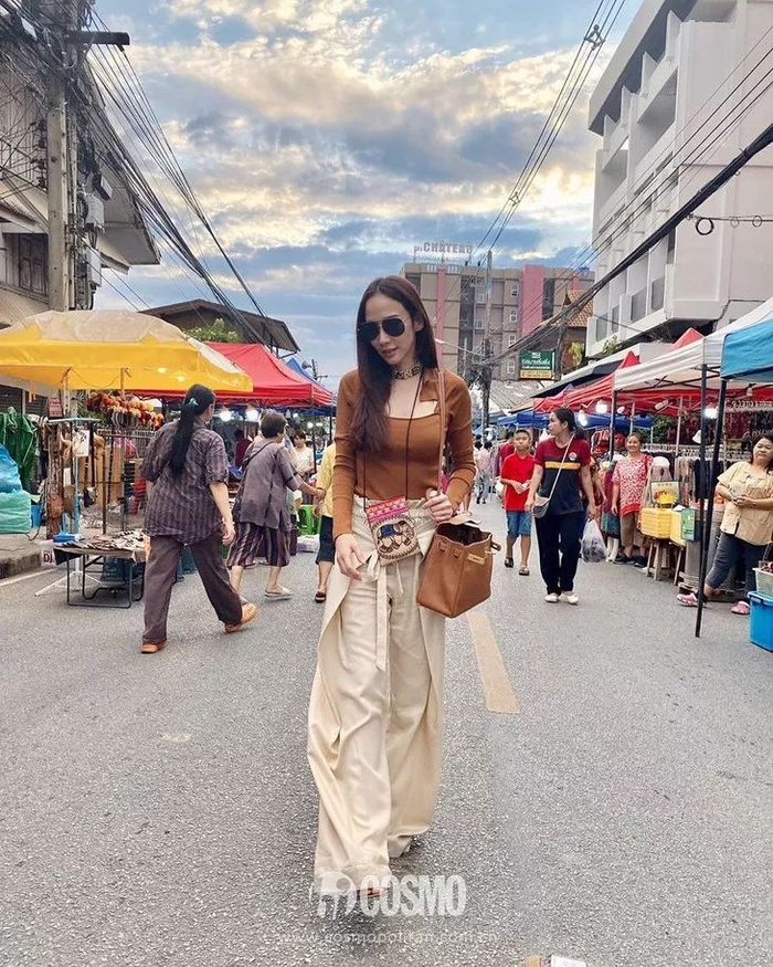 毕竟是身在热带东南亚的泰国,难得穿一回裤装的Aump会巧妙的运用同色系穿法凸显气质。