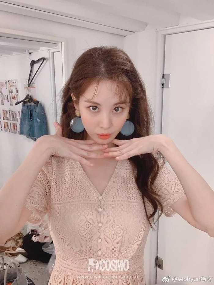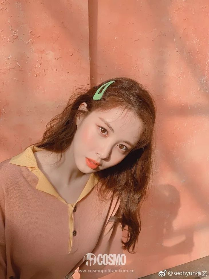 穿上奶橘色针织Polo衫的徐玄巧妙的加上一枚发夹点缀,心机满满。