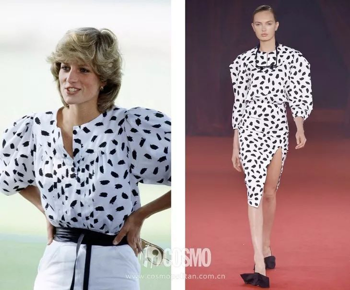 黑白波点是法式风格中极具代表性的元素之一,有一种自由的公主气息。早在上世纪的90年代,戴妃就用一件波点衬衫做了说明。
