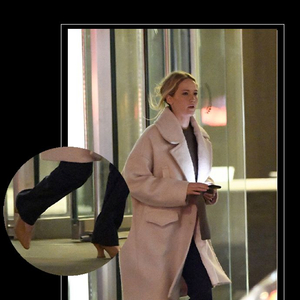 北美的Jennifer Lawrence踩着花盆跟的鞋,搭配一身驼色大衣匆匆疾行。