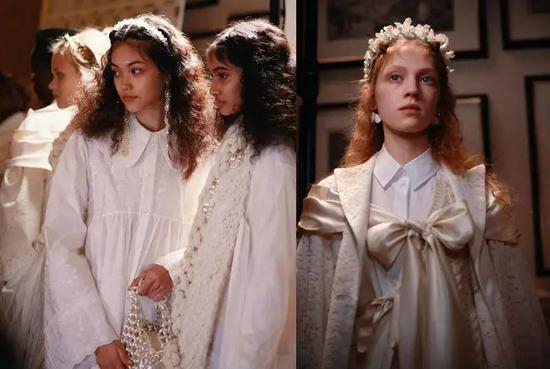 Simone Rocha 能把珍珠元素用得特别浪漫。它把珍珠一字夹带火后,仙女们头顶的珍珠发箍,也轻盈高贵。