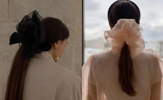 今年还流行更大的‘欧根纱发圈’,质地很轻盈,轮廓也更蓬松,感觉更仙。
