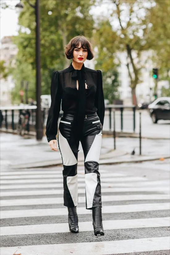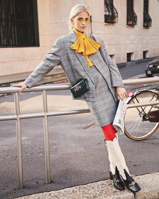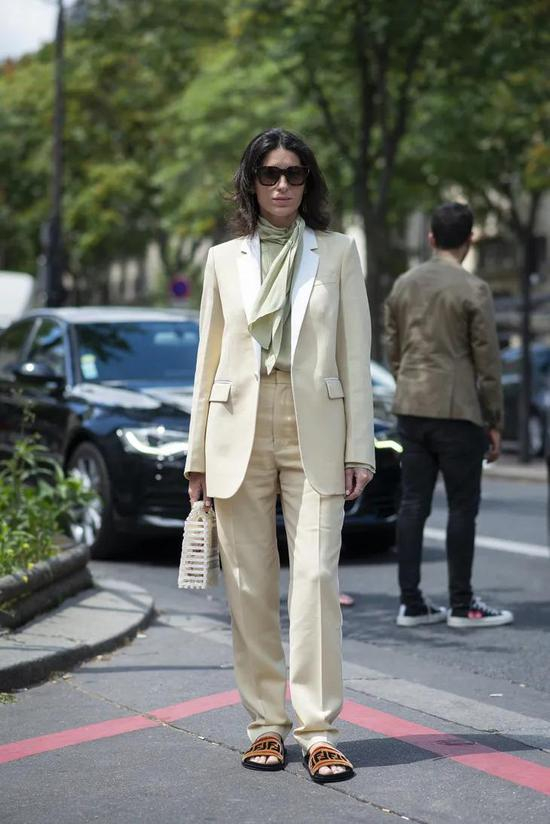 首先我们要在细节上下功夫,比如让飘带变身为方巾、披肩或围巾,让趣味感成为整身look的重点。