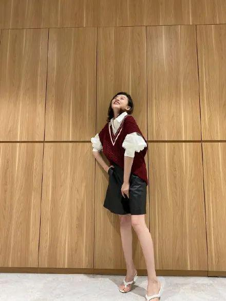 Oversize 的 V 领毛线背心在今年夏天就被许多韩国女团爱豆上身带火,搭配宽松白衬衫和西装五分短裤英伦学院风满满,如果不想太 Boyish,可以像祖鹅这样搭配细高跟和蓬松长发展现腿部线条,是又酷又性感的学姐~