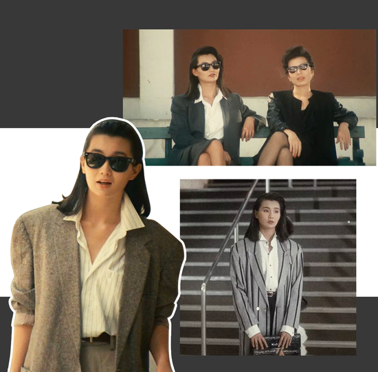 工作之后两个女主的穿搭随着她们生活轨迹的不同也完全不一样了,张曼玉饰演的将南孙也因为在时装公司上班,穿得没那么主流,是八九十年代盛行的男装风Look。