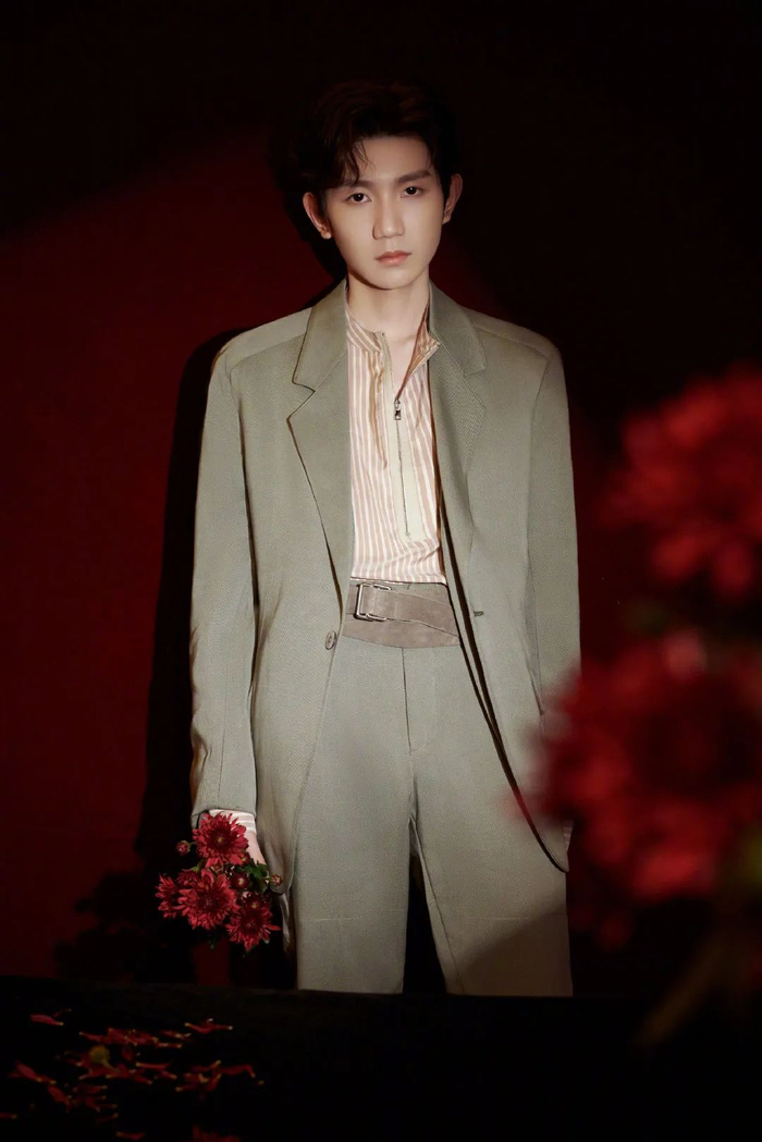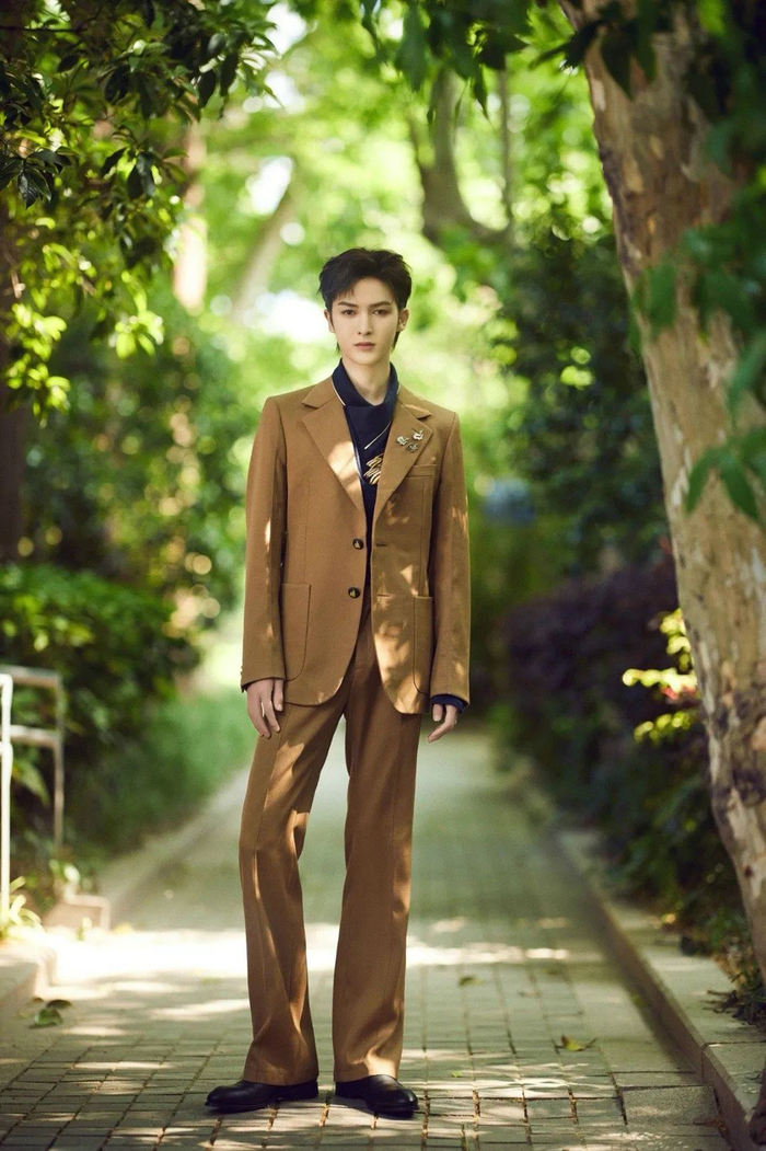 █最后一位是朱正廷,他选择近年来非常受欢迎的卡其色套装,而且版型也是复古的纤细廓形,垫肩、收腰、裤款微喇。