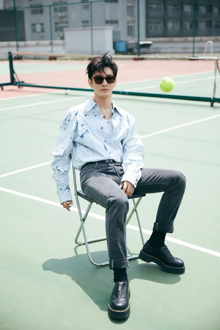█黄晓明这件冰纹印花衬衫来自设计师品牌 Feng Chen Wang2021 春夏系列,采用了传统的蓝印花工艺,黄晓明以灰色牛仔裤和带有先锋感的拉链皮鞋与之搭配,不仅是层次分明,简单利落的一身也看到了传统文化元素与新潮的机能感交相呼应。
