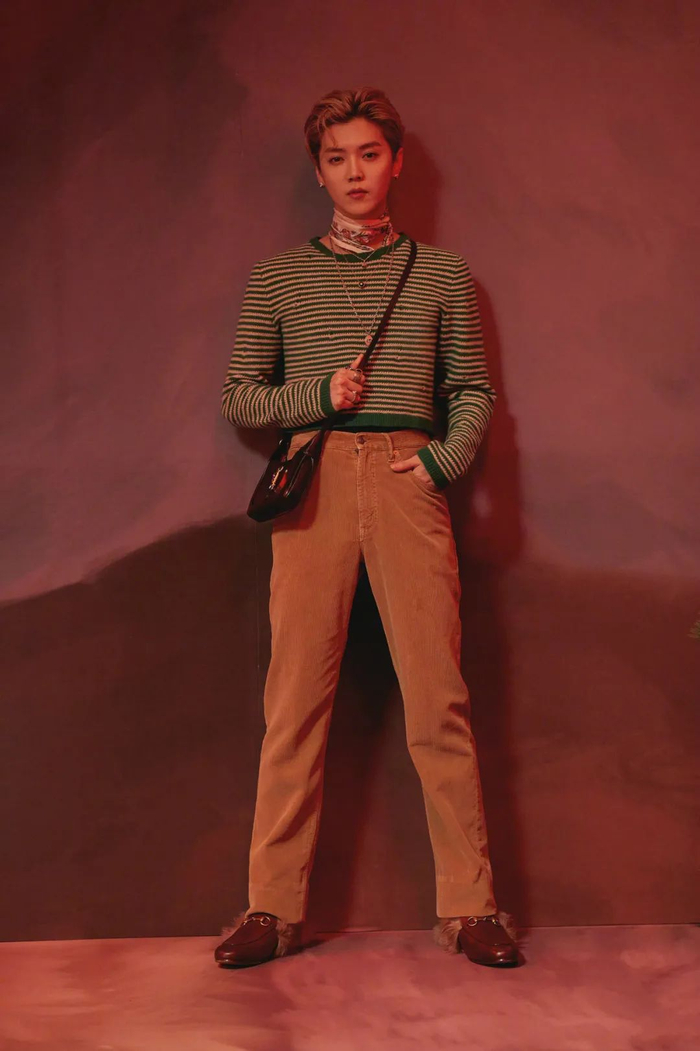 █鹿晗穿上了 Gucci 的灯芯绒长裤搭配黄色横条纹的针织衫,总体偏暖的大地色系,再通过丝巾、首饰等细节单品去“点亮”饱满的复古奢华,也是文艺与浪漫共存的优雅少年。