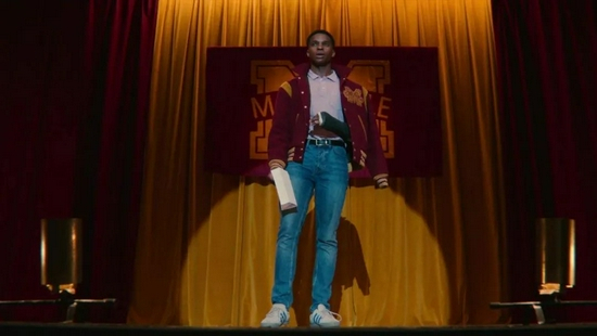 该款校队夹克充斥着 Jackson 的剧集造型,就如同游泳训练充斥着他的日常生活那样。万年不变的着装实则是导演对人物的隐形描绘,运动员生活其实并不简单,枯燥的高强度训练,名次的沉重压力,都十分容易造成心理健康问题,本届东京奥运会上,美国体操巨星拜尔斯即是一个真实例子。