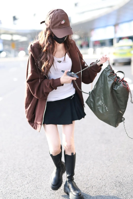 看,这不又一个咖色外套的。鸭舌帽一戴,很美式休闲的一套,姐姐身材也太好了吧,必须夸一夸。