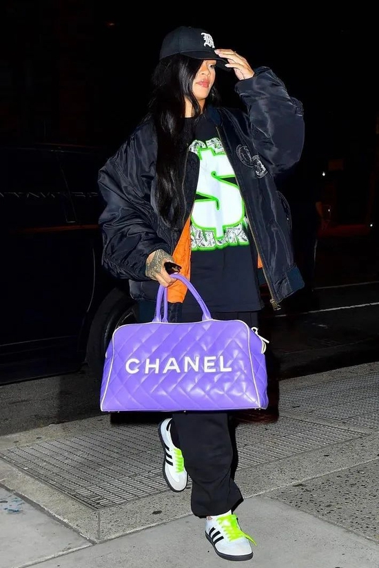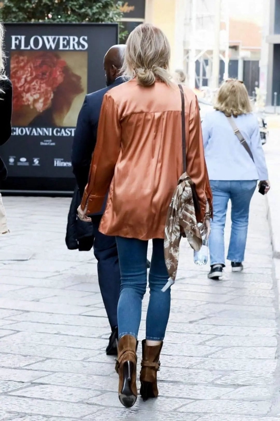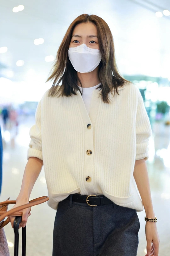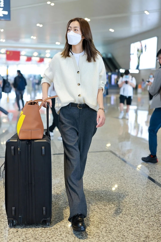 但自己的调性还在,可以看到她依旧随身携带超爱的单品——丝巾,这次把它系在了包包上,感觉已经是她的专属单品了,看到丝巾就可以一眼认出来这是谁!