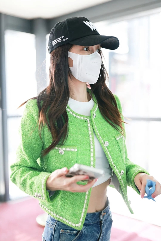苹果绿小香风外套十足亮眼,是闻得到的清新,内搭露脐白T还能小秀一把腹肌~香芋紫的行李箱也够阔爱。