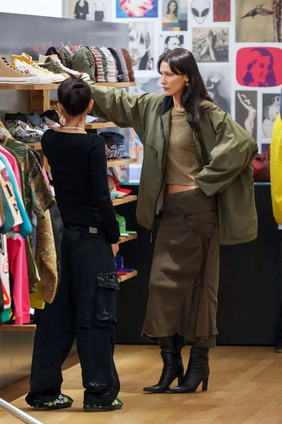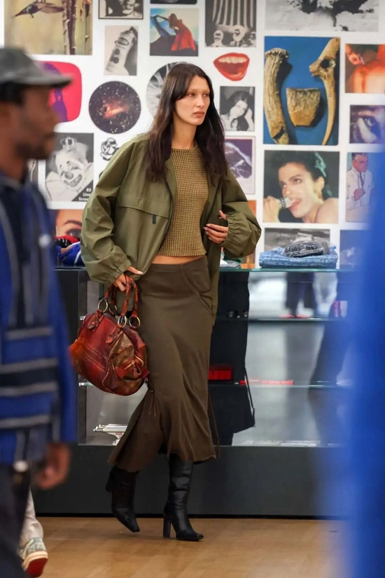贝拉真是从头到脚都时髦得毫不费力呢,灰黑色的搭配带来了清冷的高级感,大面积露肤更让人看到她紧致和小麦色的皮肤,是非常健康的性感。