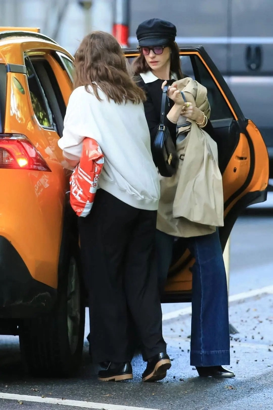 这身眼熟,之前她穿过类似的一身,不过上衣从黑色的Crop Top换成了Polo衫,搭配贝雷帽➕短皮靴,还抱着件格子外套,是携着一丝英伦味儿的纽约客(话说,看着安公主拦taxi,又有点梦回那啥时期了)。