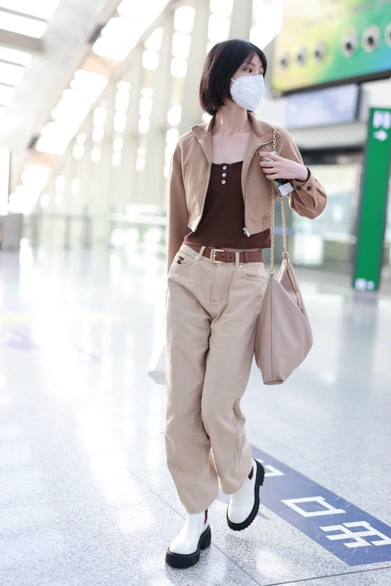 这几周好多女明星都穿了咖色、大地色、卡其色这类的衣服,秋意也是越来越浓了哈。毕竟这种配色的套装真的是永不过时的“一眼时髦”范儿,邱天用来搭配黑白切尔西靴,蛮有新意的。