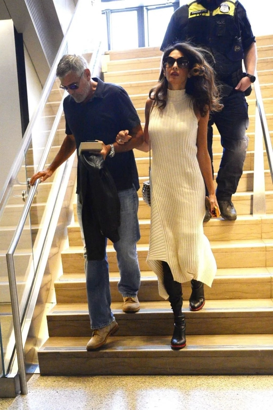 咱们律政俏佳人奶油色坑条长裙在身,温婉大方,而乔治走在老婆旁边,一如既往的朴素~(BTW,胡子是不是该刮刮了?)