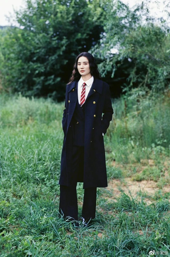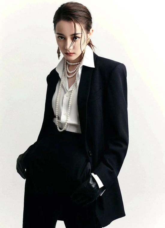 还可以在面料上,增添细节感。比如傅菁这身光泽感的真丝西装,层次感的前襟设计拜托了常规斑驳领的无聊,再配以利落的发型和红唇妆容,气场拉满。