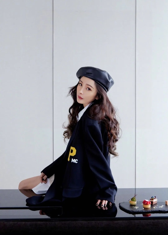 配饰方面,搭配一顶黑色皮革贝雷帽,甜度进阶。