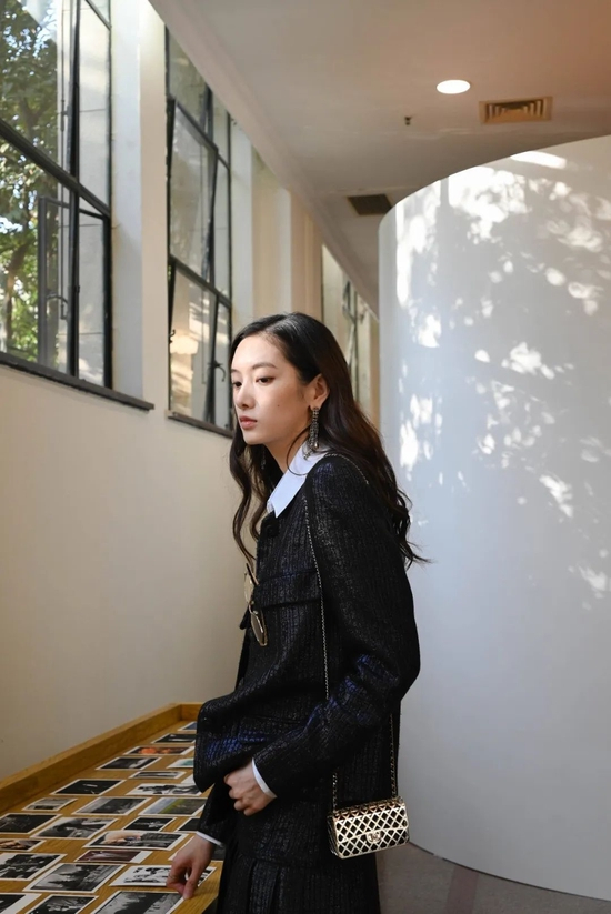 Cici这身Chanel的细纹软呢套装,内搭经典翻领白衬衫,透着几分“精英气质”,对于参观展览、抑或是更正式的场合,都能轻松驾驭。