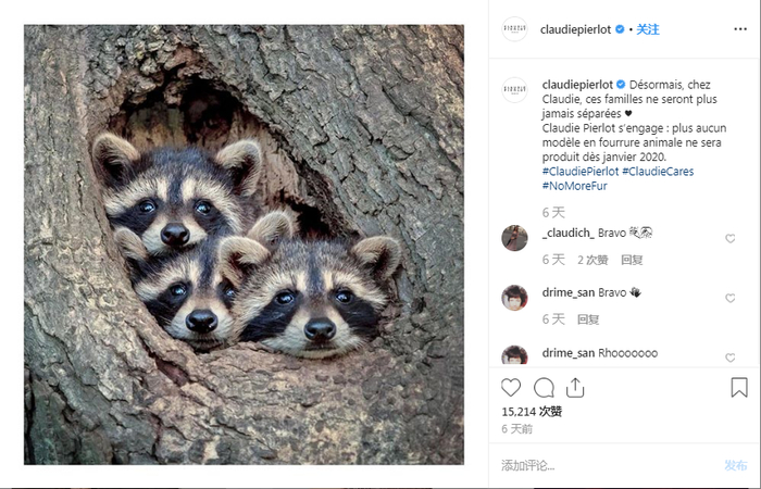 周三,Claudie Pierlot在其Instagram主页上公布了这一消息。“从现在开始,这些家庭将永远不会分离,”品牌在一张画着三只浣熊蜷缩在树干上的图片下面的说明中写道。“从2020年1月开始,Claudie Pierlot将致力于停止其个成衣产品系列中的皮草生产。”