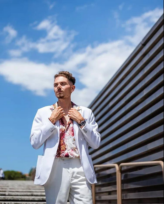相较之下,Justusf Hansen这身泡泡纱套装显然会更适合当下的商务休闲穿着语境。即便是海军蓝套装,但泡泡纱在为绅装控送上清凉之余,也用其独特的颗粒饰面缓和了深色套装的严肃氛围,充满细节感。再配合上内搭的顺色浅丹宁衬衫以及小白鞋,绝对是耐看不过时的搭配范本。