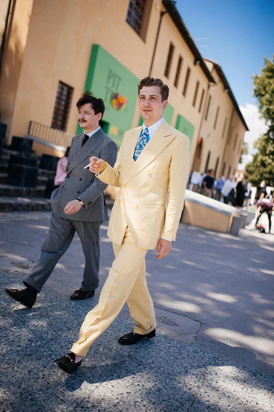 而现在的PITTI UOMO本质上还是一场男装展销会,不过得益于社交平台的兴起,参展人士的穿着都俨然成为了展会上的一道靓丽风景线。