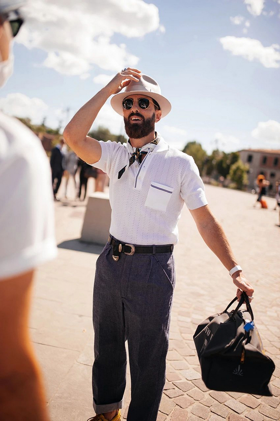 说到复古流派代表,就不得不提Guillaume Bo。这身草帽+纽扣领丹宁衬衫+乐福鞋的棕色套装造型,完美描绘了英美(British-American)的乡绅风格,同时兼顾优雅与时髦。