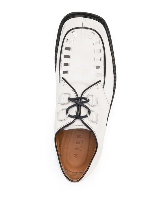 在最近季的产品中,品牌推出了方头布洛克鞋单品。鞋面外层由白色麂皮绒面打造,鞋头细节处由银色铆钉作为点缀,并配以厚实的橡胶鞋底,为鞋履增添舒适而时尚的触感。