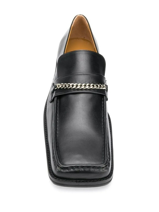今天推荐的这款黑色牛皮方头乐福鞋,亦延续品牌一贯「不寻常」设计风格,同时也是 Martine Rose 当下最热门及代表性的单品。它的外观采用的是磨光皮革,鞋面处饰有银色缆绳链以及粗低跟设计。