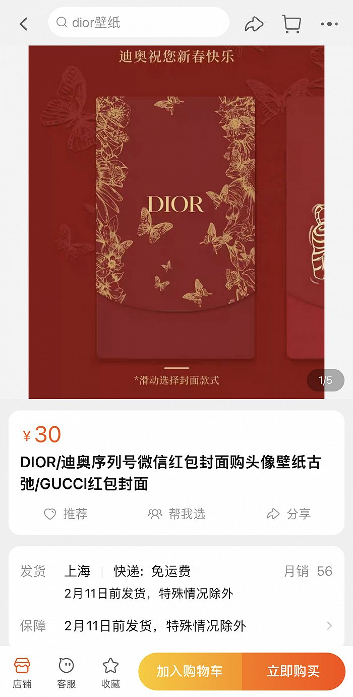 灰色产业随之催生。在淘宝或闲鱼上搜索奢侈品牌红包封面,可以看到大量的商家在销售领取序列码,其中古驰和路易威登等品牌的封面可以卖到30元的价格。奢侈品牌的形象为虚拟的红包带来了高溢价,作为社交货币的属性则是引发网友疯狂追逐的原因。