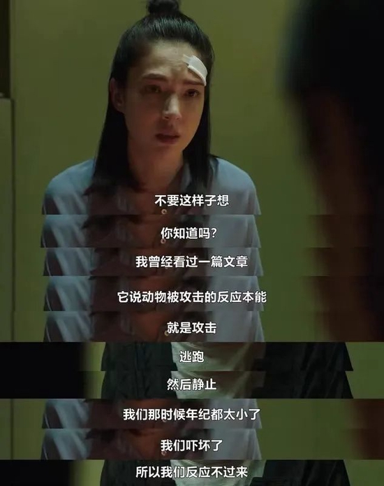 编剧借林晨曦之口,讲清当中的道理:动物被攻击的反应本能,就是攻击、逃跑,然后静止。弱势一方(女性、小孩)受到胁迫时,通常会因极度害怕“反应不过来”,失去最佳反抗时间。