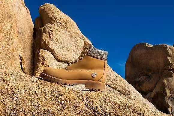 在Jimmy Choo与美少女战士联名鞋款推出之前,施华洛世奇仿水晶已经被多次使用到Jimmy Choo其他系列产品中。比如,2022年11月,Jimmy Choo与户外鞋履品牌Timberland宣布首次合作,推出限量联名款鞋履,包括高跟踝靴、工靴等多个男女鞋款。其中一双细高跟绑带踝靴的表面镶满的“水钻”,以及一双脚脖处镶满“水钻”的工靴,实际上都用了施华洛世奇供应的仿水晶。