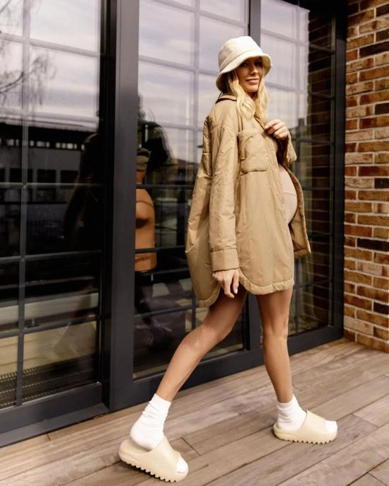 在“卸货”前一天,她还穿着一身裸色的套装和大衣在街上街拍,选择了Yeezy拖鞋搭配白袜这种最近时髦精都爱的穿法。