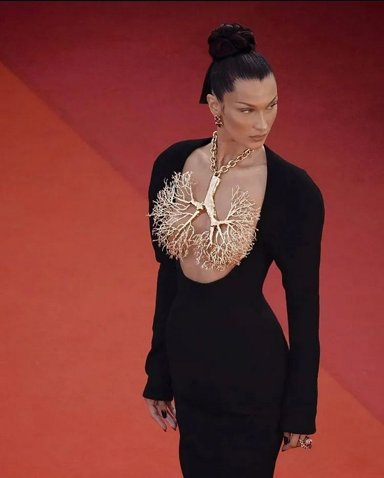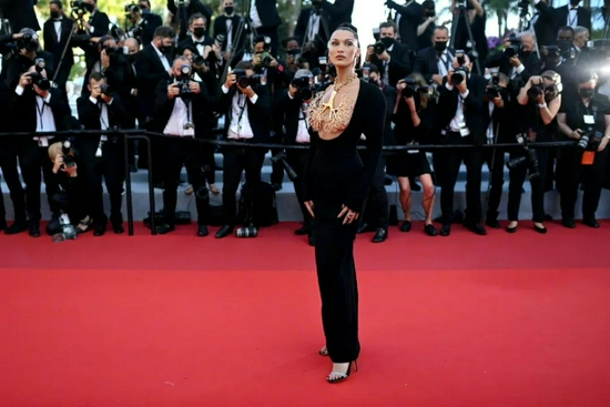 这是戛纳红毯的第二套造型,在Bella出现的那一刻,这身look就注定成为红毯上的经典瞬间。在Schiaparelli2021高定礼服的加持下,Bella的强势与力量,性感与优雅全部涌现。