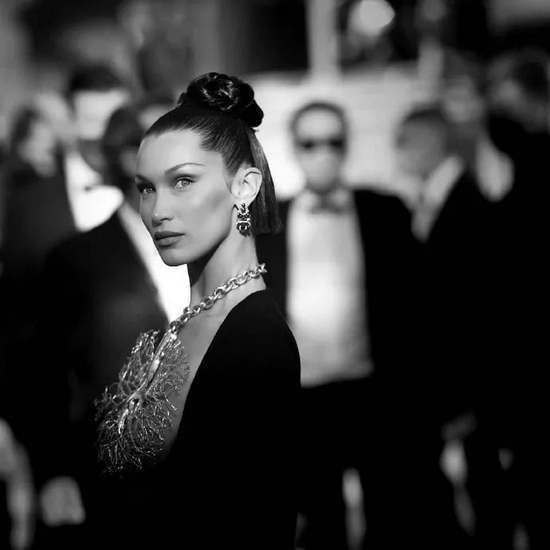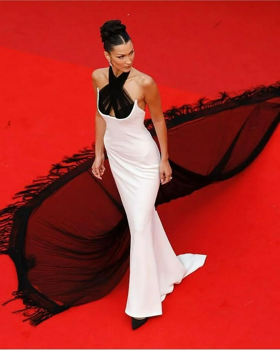 2021年7月,Bella穿着Jean Paul Gaultier2002年高定礼服(复刻版本)出现在红毯上,轻柔神秘的黑纱缠绕在白色鱼尾礼服之上,整个造型对比5年前的自己,如今的Bella用她自己的话说就是“一个真正成熟的女人”。