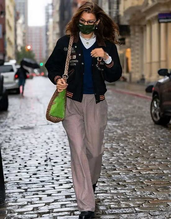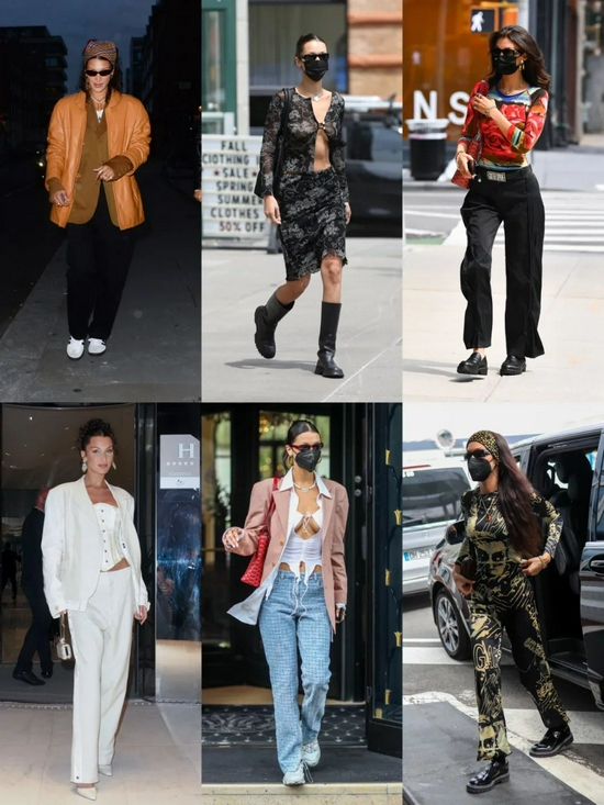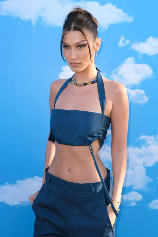 2020年Bella受邀出席LV2021秋冬男装秀,她穿了肥大的裤子,套上了大大的外套,以自己的方式性感的演绎了Total男装look。