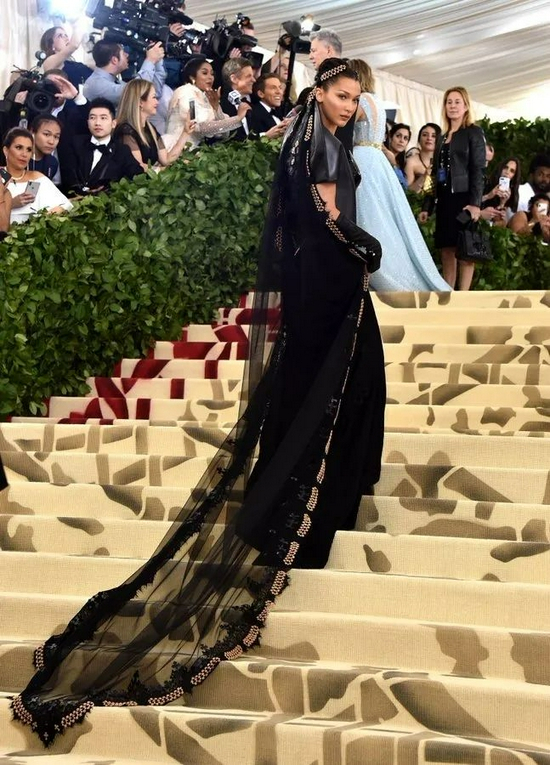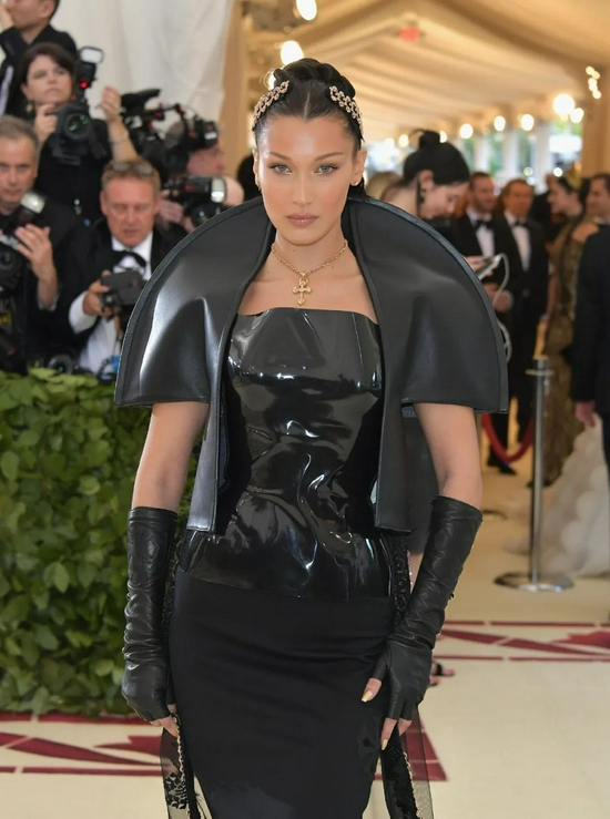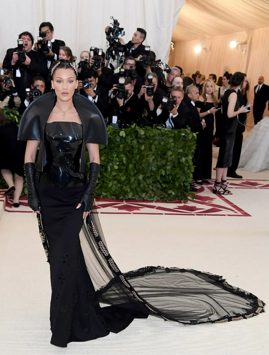 2018年,Bella再一次走上Met Ball,这次她终于穿了一身“属于自己的衣服”,整套礼服来自Chrome Hearts,不同质感的黑色面料交融在一起,化身为一个冷艳、克制的黑暗天使。
