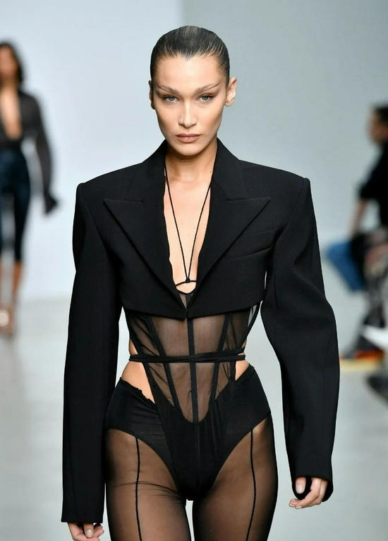 时间来到2019年,此时的Bella凭借着兢兢业业的“超模打工人状态”,已经被很多人形容为“养成系超模”了,她通过训练,台步不断进步,可驾驭的风格和造型也越来越多。Mugler这场秀,也是被认为“很Bella”的一次造型。