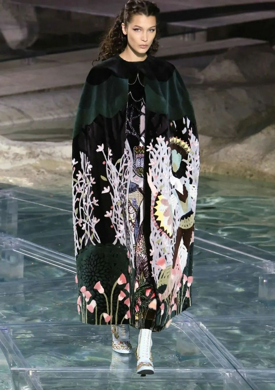 还记得这场秀刚出来的时候正值国内疫情的开始,编辑们因为去不了时装周绝望的在办公室刷着秀图,然后,就看到了Bella为西太后这场秀的闭幕造型。