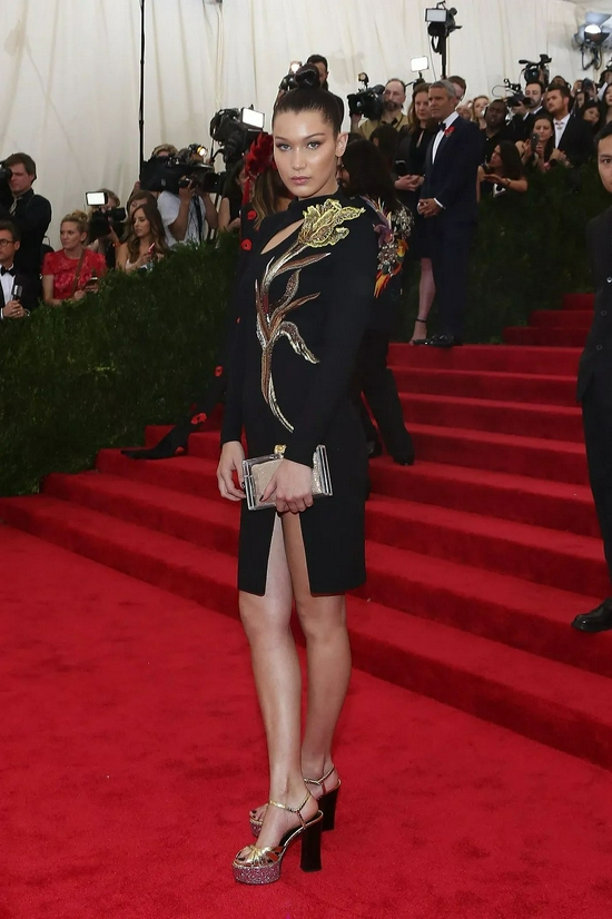 就这样穿着Top Shop这身老气横秋的黑色紧身裙,踩着自己现去商店买的Saint Laurent金色凉鞋,再搭配着僵硬的肢体动作,Bella走完了她的第一次Met Ball红毯。
