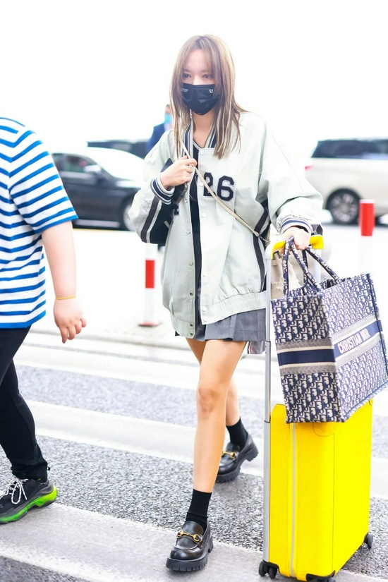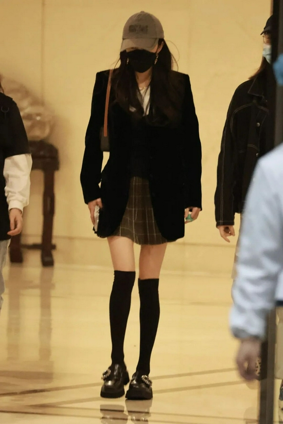 这一身她在西装外套里的内搭是格纹半裙,让外套传达出一种“制服感”。下半身是长筒袜和乐福鞋的搭配,视觉上有拉长小腿的效果。